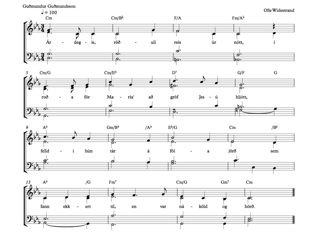 Árdegis, röðull reis úr nótt, í roða fór María að gröf Jesú hljótt. Felldi hún tár á föla jörð sem fann ekkert til en var náköld og hörð.