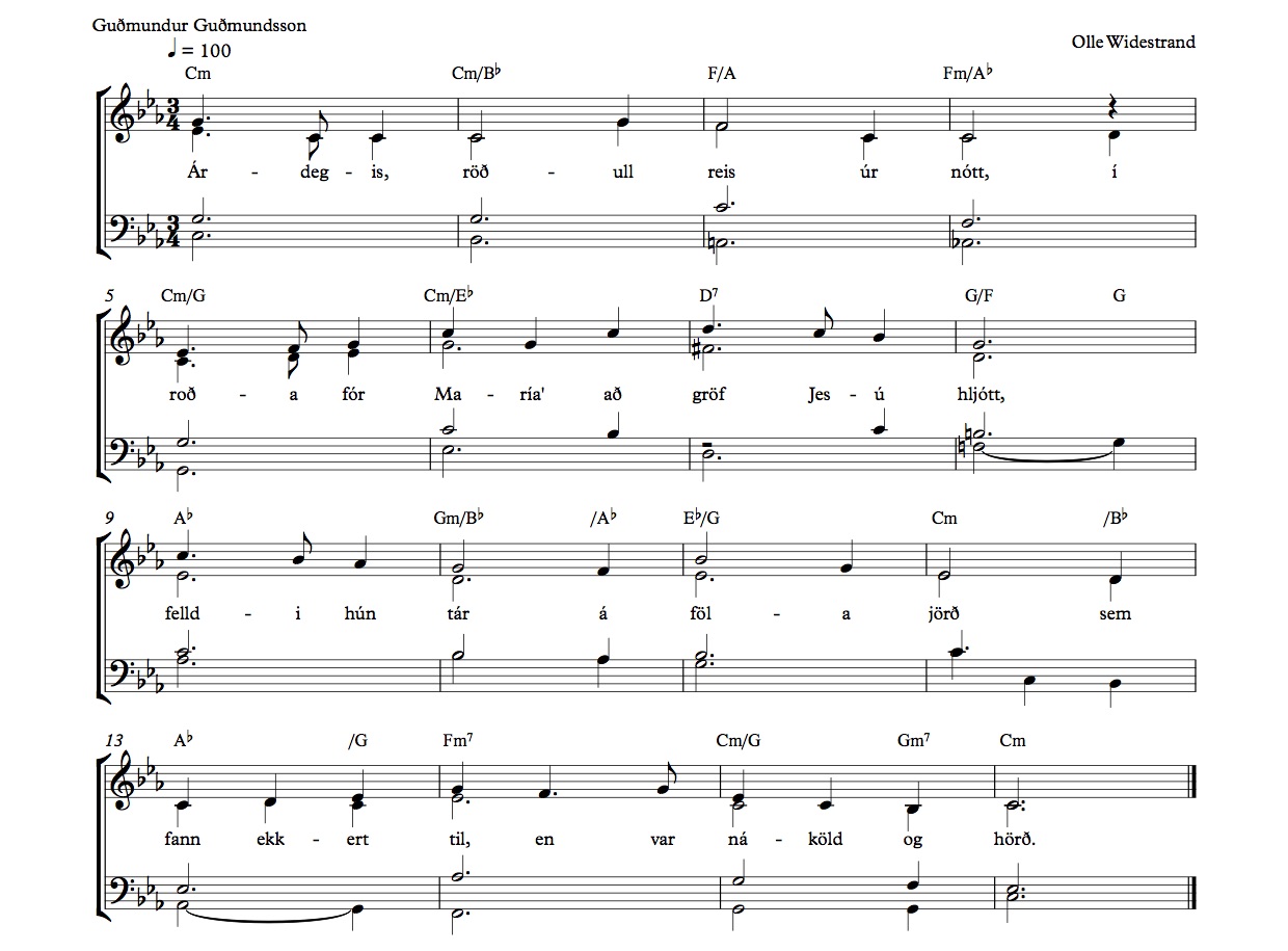 Árdegis, röðull reis úr nótt, í roða fór María að gröf Jesú hljótt. Felldi hún tár á föla jörð sem fann ekkert til en var náköld og hörð.