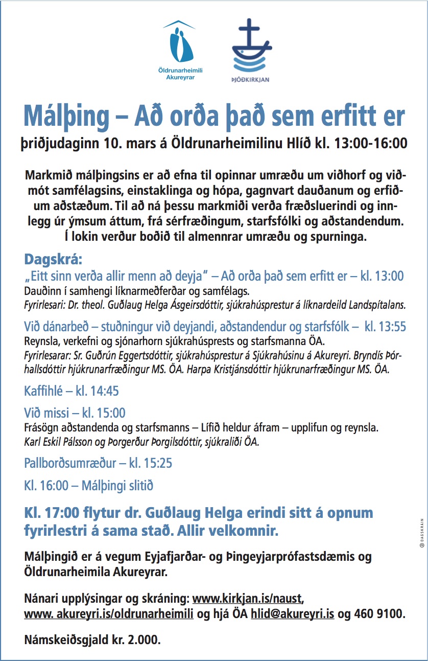 Málþingið var haldið á vegum Eyjafjarðar- og Þingeyjarprófastsdæmis og Öldrunarheimila Akureyrar. Það var hugsað fyrir starfsfólk öldrunarheimila, sjúkrahúsa og heilsugæslu, kirkju, kirkjugarða og útfarastofnanna.