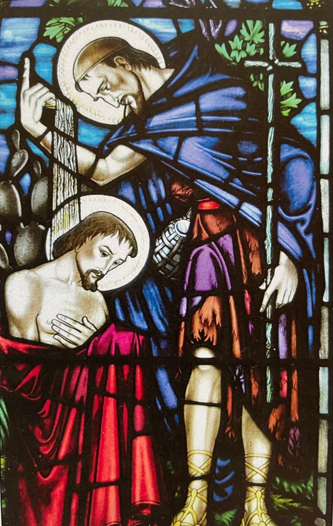 Guðspjall dagsins er hér í fimmta kórglugganum í kirkjunni. Það er af skírn Jesú í ánni Jordan. Jóhannesi skírara fannst það ekki rétt að Jesús tæki iðrunarskírn en fyrir þrábeiðni Jesú skírði Jóhannes hann til að fullnægja öllu réttlæti. Þar með hófst píslarganga Krists og við fylgjum honum nú á sunnudegi í föstuinngangi.