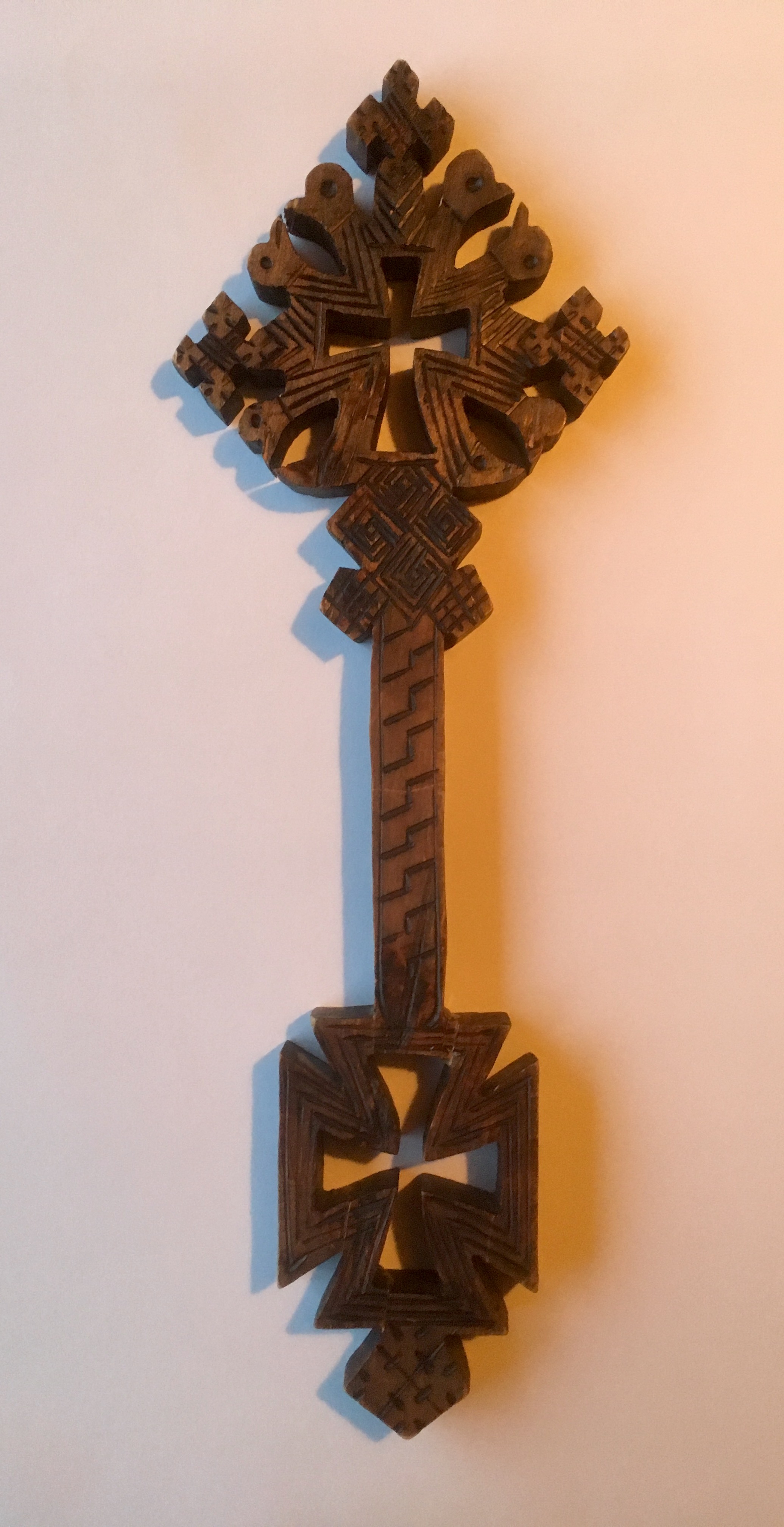 Þá opnast mér stærri og meiri saga. Það birtist tákn kærleikans, krossinn. Ég eignaðist þennan kross fyrir löngu, prestslegur kross frá Eþíópíu, sem þeir signa fólkið með í rétttrúnaðarkirkjunni. Þið sjáið krossana en um leið sjáið þið að þetta er tré, lífsins tré. Þannig er aftökutækið orðið að tákni lífsins, af því kemur líf. Þegar betur er að gáð sér maður fugla í trénu, tvo og tvo saman, paradísarfuglar um sambandið himneska. Og svo er þetta einnig lykill ef hann er settur á hlið. Krossinn er lykill að Drottins náð.