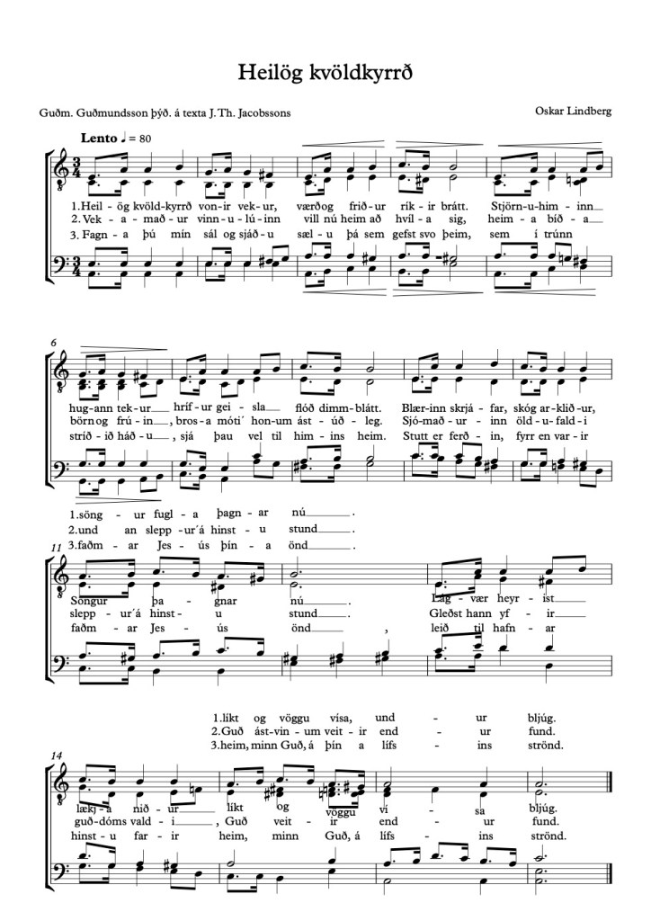 Heilög kvöldkyrrð vonir vekur, værð og friður ríkir brátt. Stjörnuhiminn hugann tekur, hrífur geislaflóð dimmblátt. Blærinn skrjáfar, skógarkliður, söngur fugla þagnar nú. Lágvær heyrist lækjarniður líkt og vögguvísa undur bljúg.
