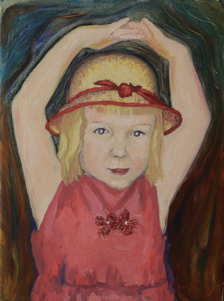 Þessi var unnin með myndinni Hjá ömmu og er af sömu stærð 30×40 máluð á striga með olíumálningu. Berglind Björk dansar hér glöð með hatt. Lauk við myndina haustið 2020.