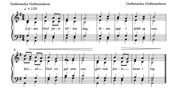 Ég samdi þennan sálm um áramót þegar ég leit yfir farinn veg. Tengiorðið lét ég koma fyrir í öllum erindunum, tengiorðið sem er að finna í lofsöngvum Davíðssálma, „því að“. Fyrsta vísuorðið í öllum erindunum er hvatningin til að lofa Guð fyrir „liðinn dag“ (1. er.), fyrir „lífsins orð“ (2. er.), „fyrir ljóssins hjörð“ – kirkjuna (3. er.) og fyrir „líkn og náð“ (4. er.). Annað vísuorðið er frekari ítrekun, svo þarna var ég að nota hugsanarímið úr hebreska kveðskapnum. Í 1. er. rímar hugsunin „Lofum Guð fyrir liðinn dagur“ við „lítum upp í þökk og von“. Hugsunin er þróuð áfram að líta upp til Guðs í þökk fyrir liðinn dag og von til hans um bjarta framtíð. Svo kemur ástæðan fyrir lofgjörðinni, þakklætinu og voninni, „því að Guð oss gaf sinn son“ og sú hugsun eða undrun rímar við og er þróuð áfram, „gjörvalt færir hann í lag“. Þannig er hvert erindi mótað af þessum forna kveðskap en jafnframt rímað og stuðlað eftir íslenskum bragreglum. Tilfinningin er lofgjörðin og gleðin yfir Guði, þar sem ég leyfi mér að gleyma mér um stund með honum einum sem elskar svona heitt. 3. er. eins og reyndar öll eru í anda Nýja testamentisins, í því erindi hugleiði ég játningu trúarinnar um kirkjuna. Ljóssins hjörð lýtur við náðarborðið, ástæða lofgjörðar og tilbeiðslu kirkjunnar eða safnaðarins er „því að Jesú andi og orð er í kirkju Guðs á jörð“. Á grísku er tilbeiðsla í merkingunni að falla niður fyrir konungi sínum og Drottni (gr. proskyneo) eins og vitringarnir gerðu sem komu og tilbáðu Jesú-barnið hin fyrstu jól. Síðasta erindið snýst um þá miklu náð, líkn og miskunn, sem er að umbreyta veröldinni. Það er ástæða til að lofa Guð. (Læt ég lagið fylgja með á nótum og hljóðskrá en það er ekki til í upptöku. Lagið á að vera í lofgjörðarstíl, glaðvært og létt, í þeirri von að það beri birtu til þeirra sem heyra, lofgjörð og gleði.)