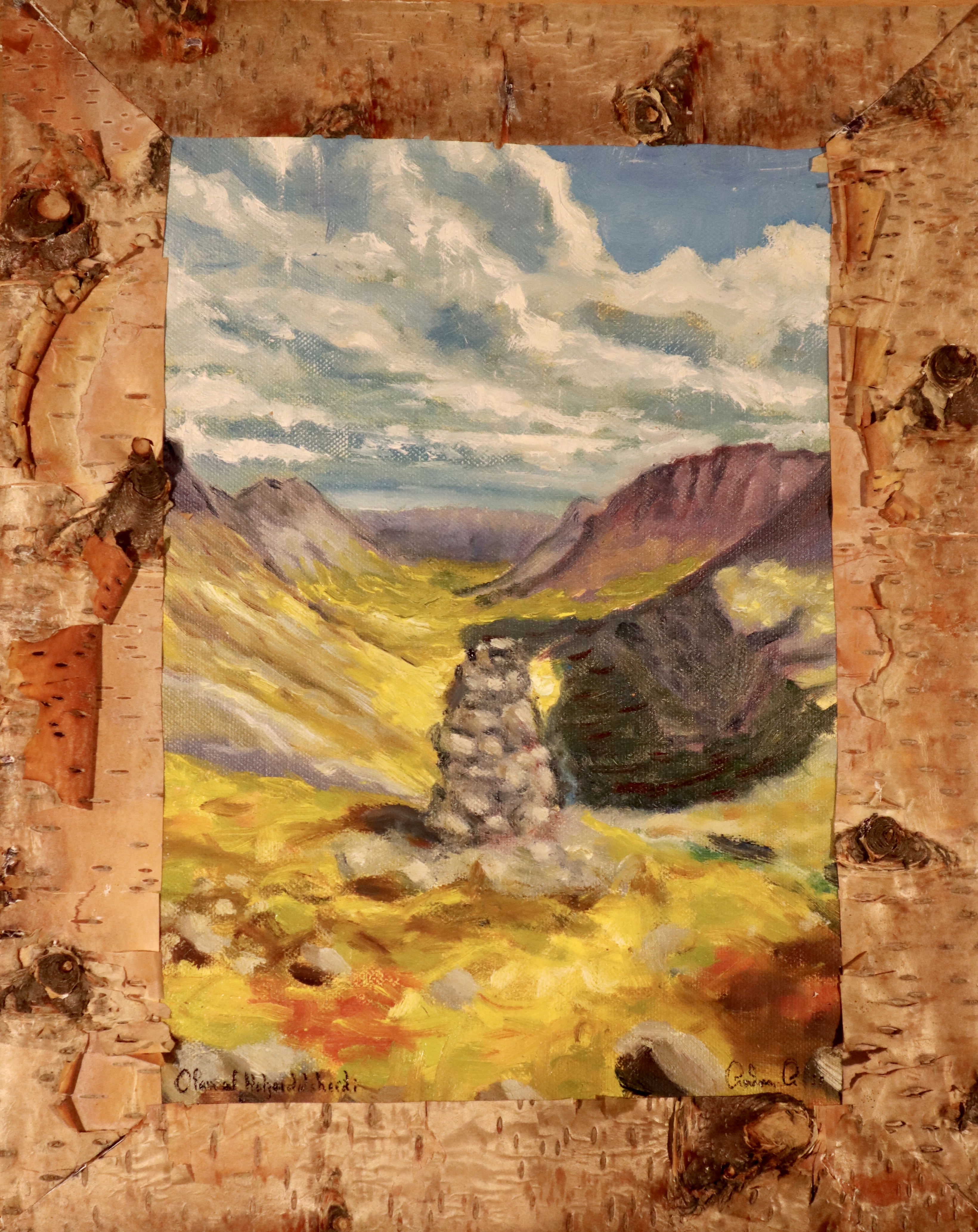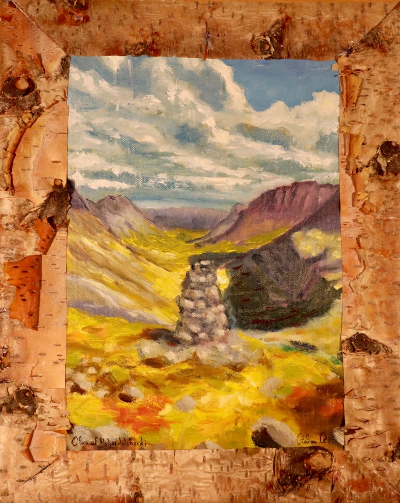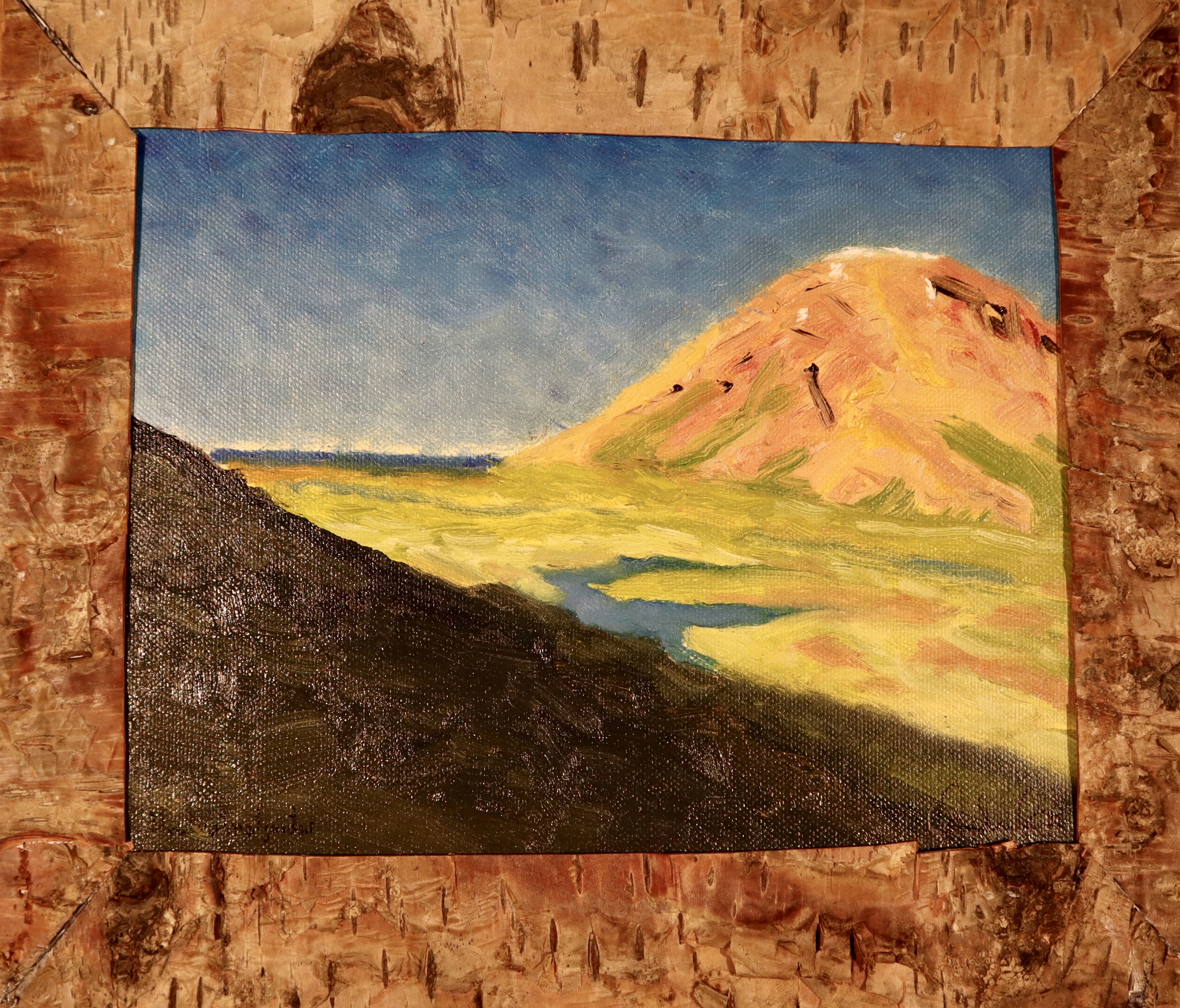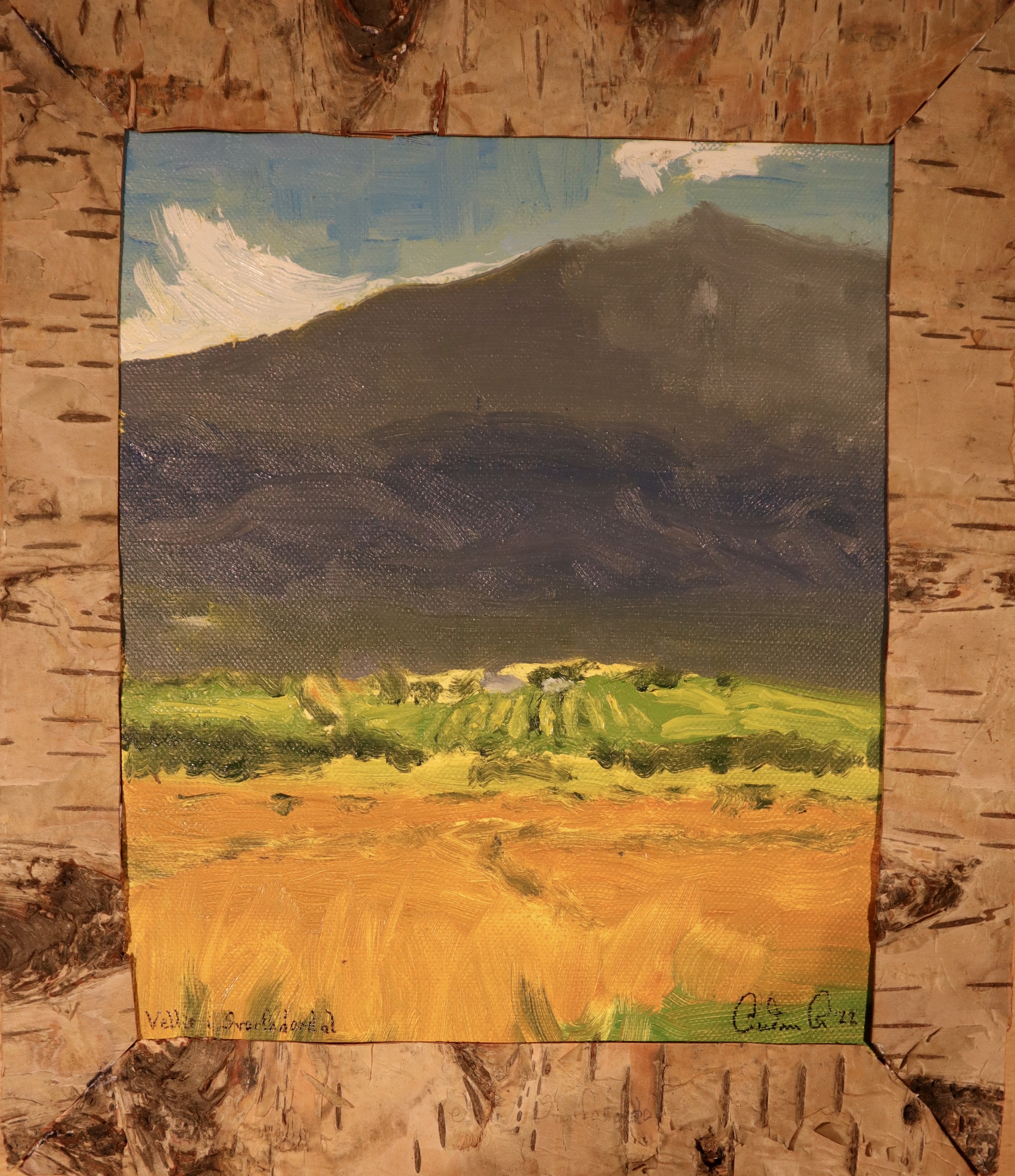 Þá hef ég verið á námskeiði í olíumálningu við Myndlistaskólann á Akureyri. Hér eru þrjár landslagsmyndir – minningar frá síðast liðnu sumri. Við hjónin fórum í Hvalvatnsfjörð með systur hennar og manni um mitt sumar. Í september gengum við upp á Heljardalsheiði, en á leiðinni niður af heiðinni var birta og skuggar áhugaverðir við vörðuna á miðri leið, séð niður í Svarfaðardal, og síðasta myndin er af Völlum í Svarfaðardal séð frá tjaldstæðinu á Húsabakka.