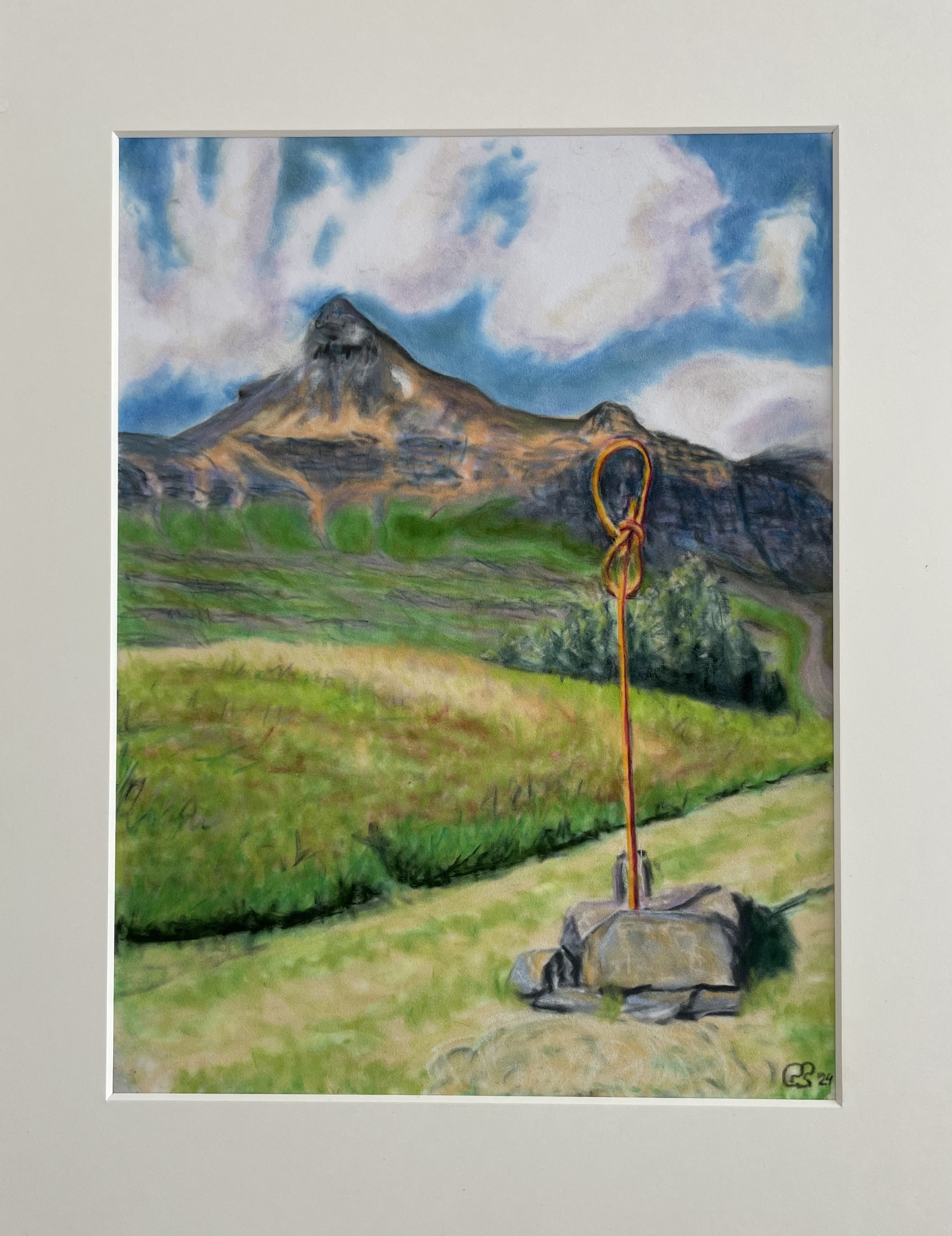 Kerling og útilistaverkið Pelastikk í Dyngjunni. Fyrst teiknuð og gerð vatnslitamynd sumarið 2023 með Gerðu systir. Svo unnin á vinnustofu með þurrpastel á velour pappír. Horft upp til fjalla.