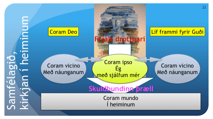 (Fagnaðarerindi og lögmál, Trúa – að vera, Kærleikur – að gera) Kristinn maður er endurfæddur til að lifa í tveimur heimum eða veruleikum, hinn opinberi (þar sem verðskuldun ríkir) og náðarinnar (þar sem allt er af gjöf), fyrir kraft Guðs í skírninni, dauða og upprisu Jesú Krists. Þannig er frelsið leiðin til að lifa í jafnvægi milli náðar og kröfu.