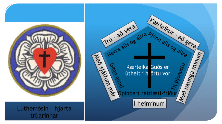 Fangamark Lúthers vísar þessa sömu leið um frelsið. Það á kristinn maður í hjarta sínu með Kristi. Út frá því vex kærleikurinn og hreinleikinn vex fram eins og lilju rósin í góðum verkum gegn því sem illt er, inn í eilífðina og dýrð Guðs.