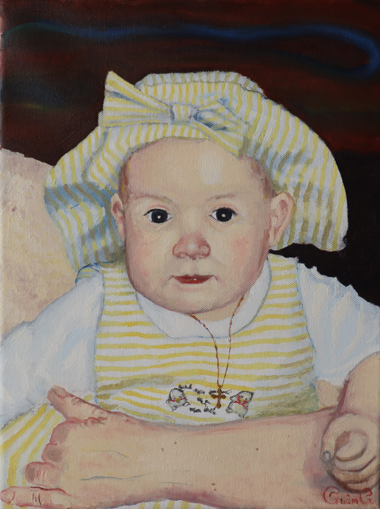 Þessi mynd er 30X40 máluð á striga með olíumálningu. Amma Bodda heldur þar á Helgu Maríu. Eins og aðrar myndir mínar hefur hún lengi verið í vinnslu en ég lauk henni svo síðastliðið haust, 2020.