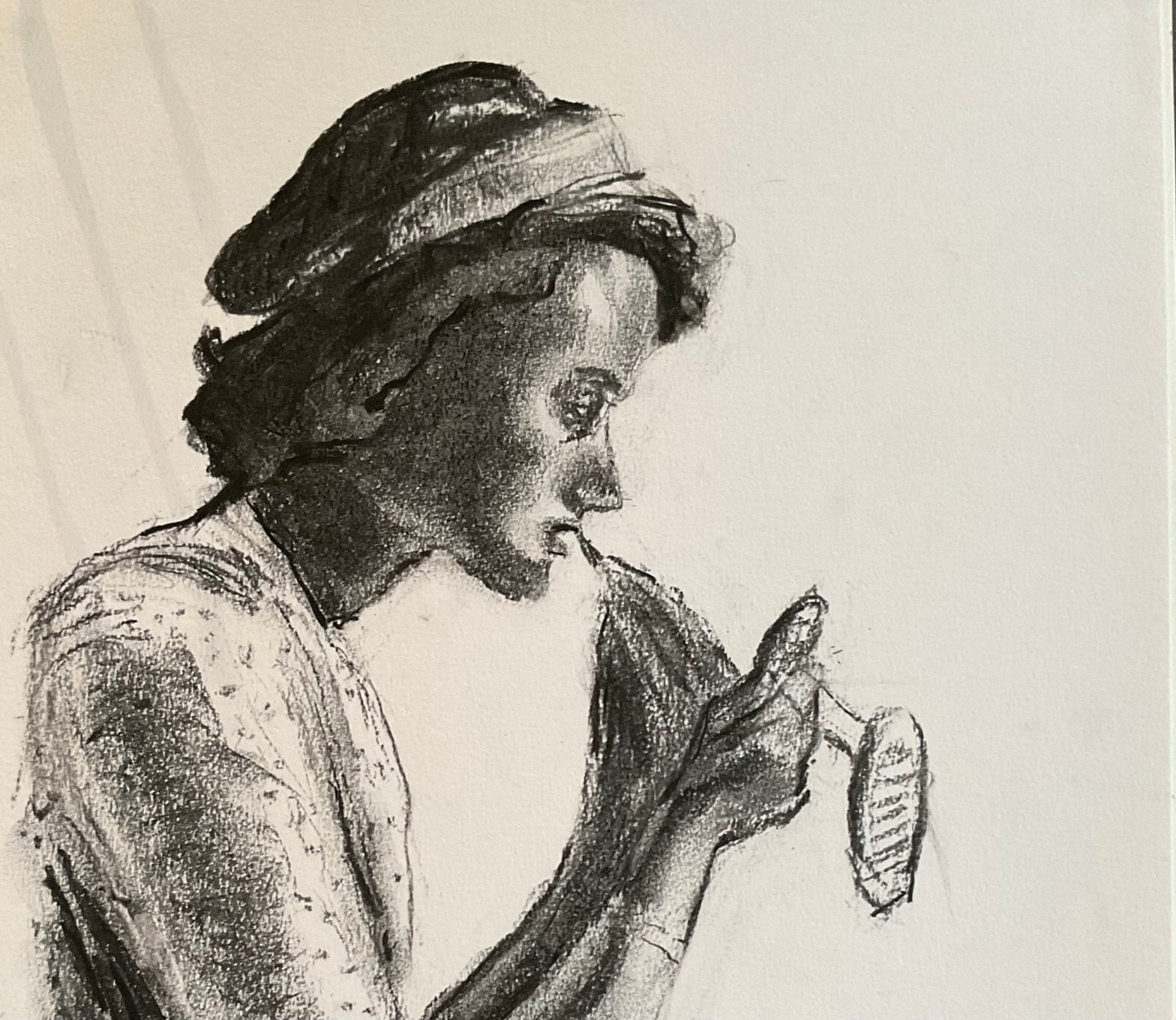 Nýleg kolateikning gerð í Myndlistaskóla Akureyrar. Kolin er kröftugur miðill. Myndin er ca 30×40 cm. Gerð eftir ljósmynd af tengdamóður minni.